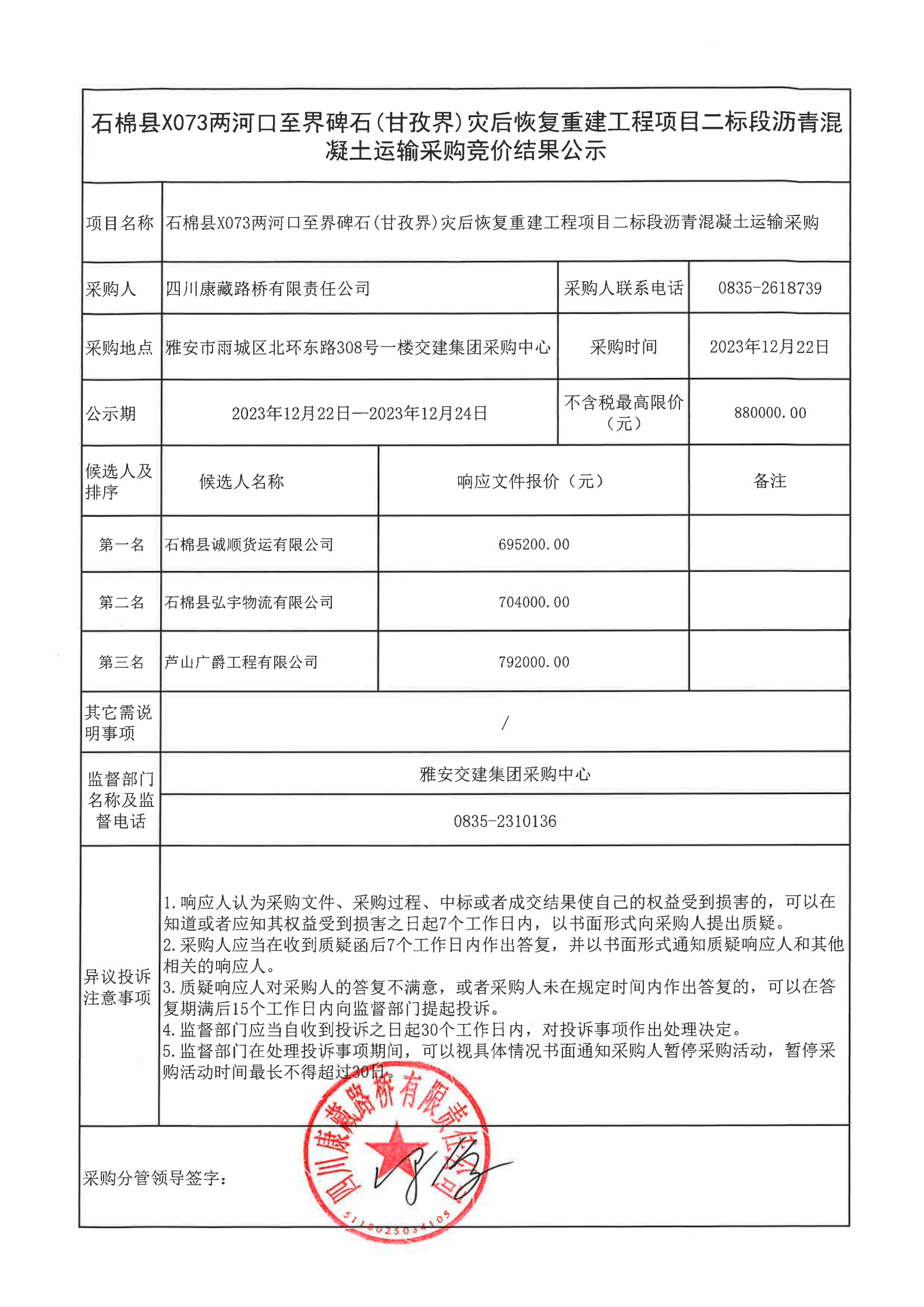 四川康藏路橋有限責(zé)任公司石棉縣 X073 兩河口至界碑石(甘孜界)災(zāi)后恢復(fù)重建工程項目二標(biāo)段瀝青混凝土運輸采購競價結(jié)果公示