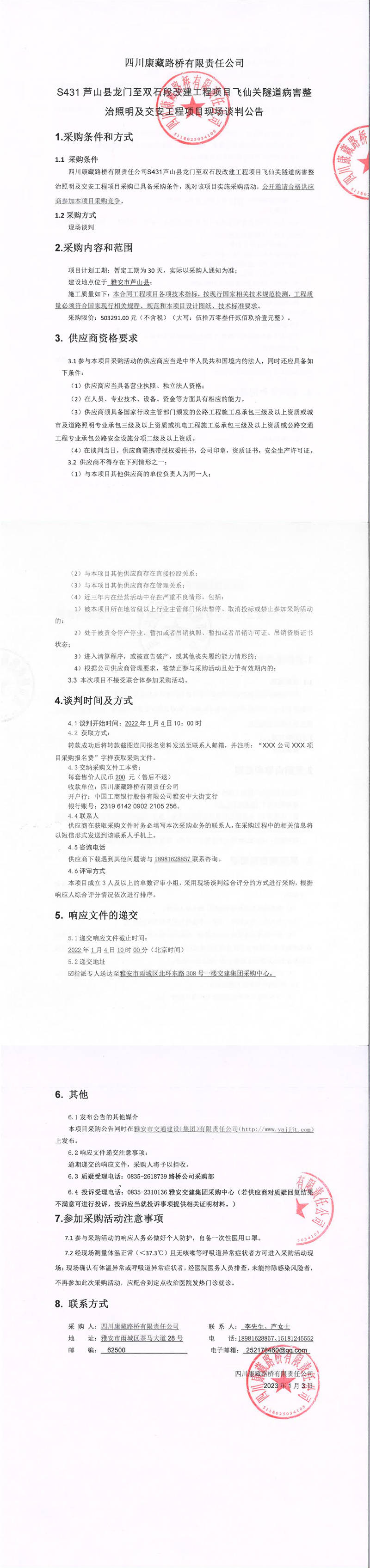 四川康藏路橋有限責(zé)任公司S431蘆山縣龍門至雙石段改建工程項目飛仙關(guān)隧道病害整治照明及交安工程項目現(xiàn)場談判公告