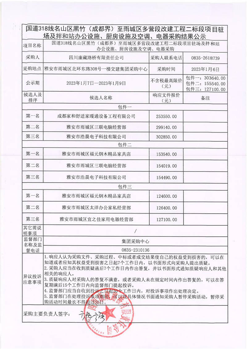 四川康藏路橋有限責任公司國道318線名山區(qū)黑竹(成都界)至雨城區(qū)多營段改建工程二標段項目駐場及拌和站辦公設施、廚房設施及空調、電器采購結果公示