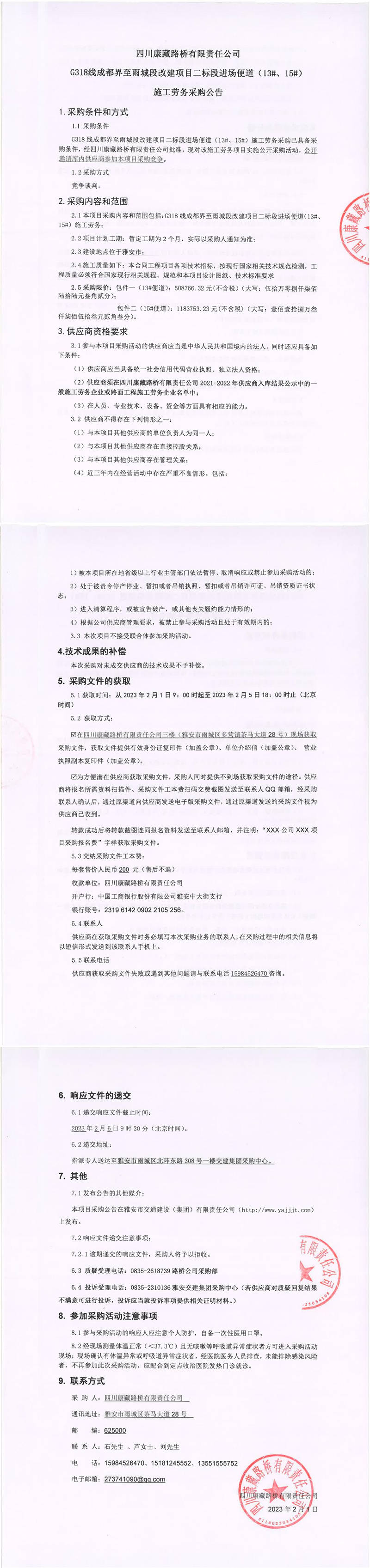 四川康藏路橋有限責任公司G318線成都界至雨城段改建項目二標段進場便道(13#、15#)施工勞務采購公告