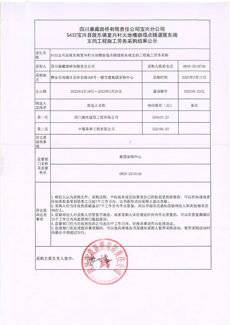四川康藏路橋有限責(zé)任公司寶興分公司S432寶興縣隴東鎮(zhèn)復(fù)興村火地槽崩塌點(diǎn)隧道隴東端路基工程施工勞務(wù)采購(gòu)結(jié)果公示