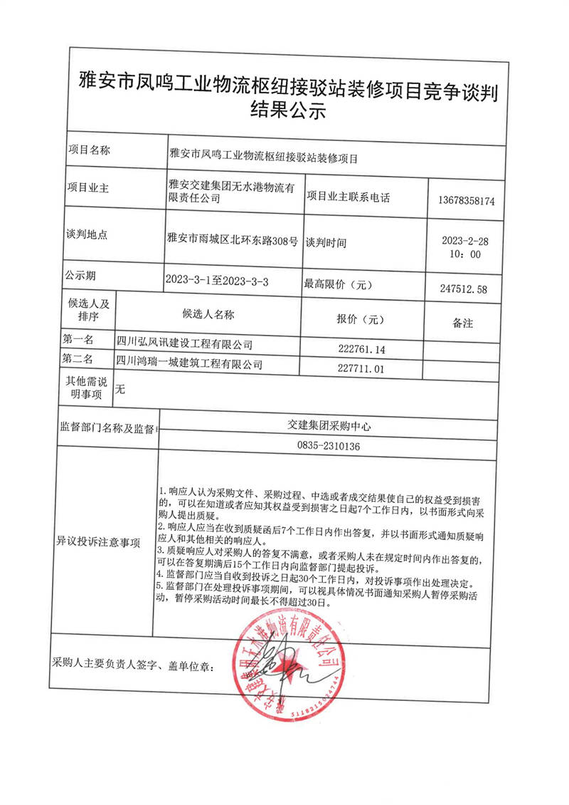 雅安交建集團(tuán)無水港物流有限責(zé)任公司雅安市鳳鳴工業(yè)物流樞紐接駁站裝修項(xiàng)目競爭談判結(jié)果公示