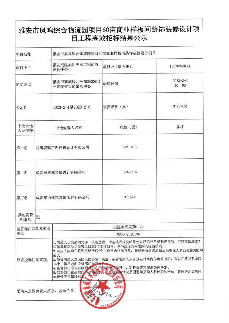 雅安交建集團(tuán)無水港物流有限責(zé)任公司雅安市鳳鳴綜合物流園項目60畝商業(yè)樣板間裝飾裝修設(shè)計項目工程高效采購結(jié)果公示