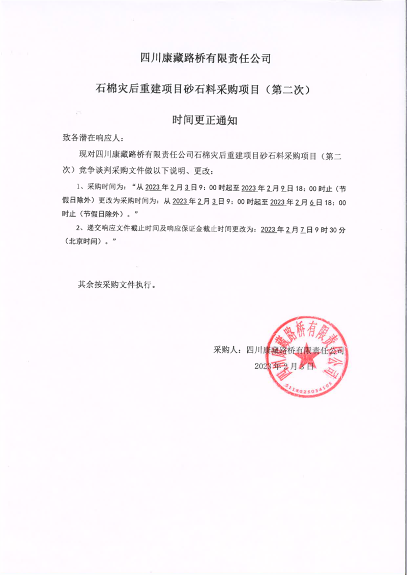 四川康藏路橋有限責任公司石棉災(zāi)后重建項目砂石料采購項目(第二次)時間更正通知