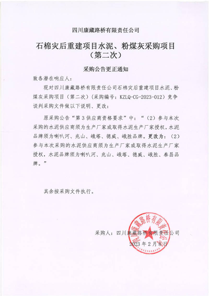 四川康藏路橋有限責(zé)任公司石棉災(zāi)后重建項(xiàng)目水泥、粉煤灰采購(gòu)項(xiàng)目(第二次)采購(gòu)公告更正通知