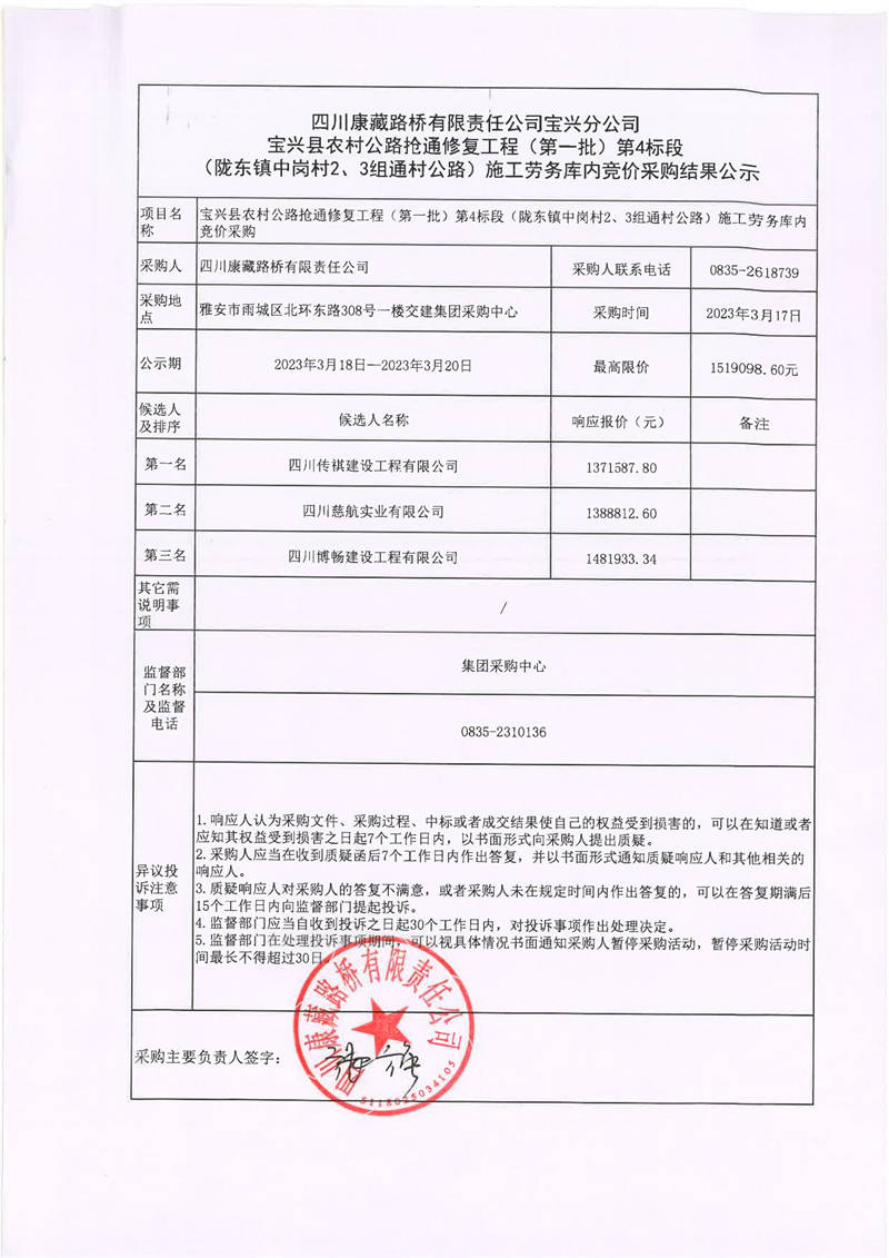 四川康藏路橋有限責任公司寶興分公司寶興縣農(nóng)村公路搶通修復工程(第一批)第4標段(隴東鎮(zhèn)中崗村2、3組通村公路)施工勞務庫內(nèi)競價采購結果公示