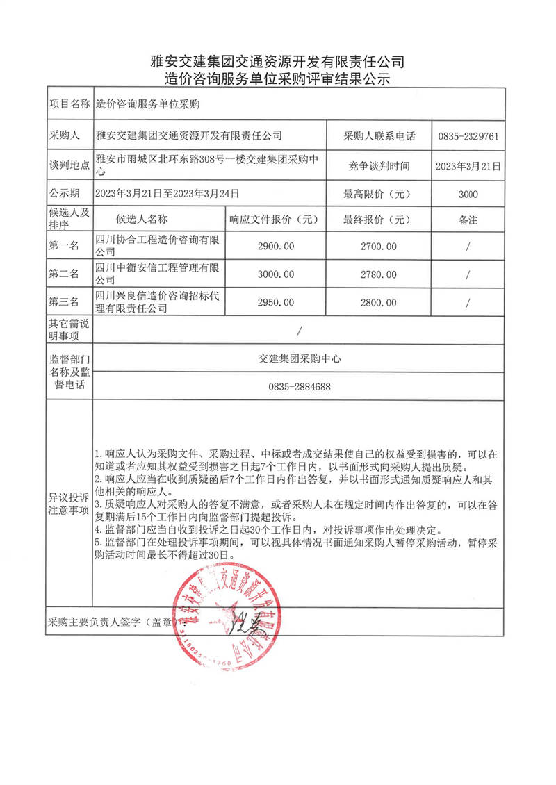雅安交建集團交通資源開發(fā)有限責(zé)任公司造價咨詢服務(wù)單位采購評審結(jié)果公示
