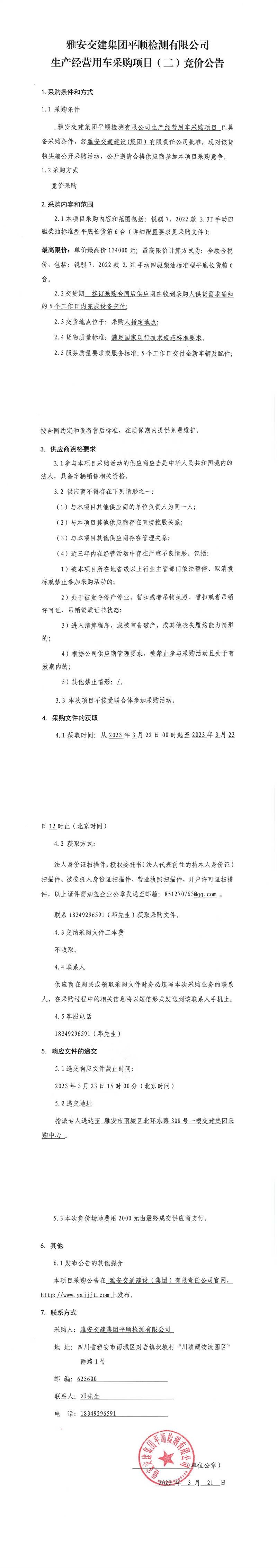 雅安交建集團(tuán)平順檢測有限公司平順公司生產(chǎn)經(jīng)營用車采購項目(二)競價公告
