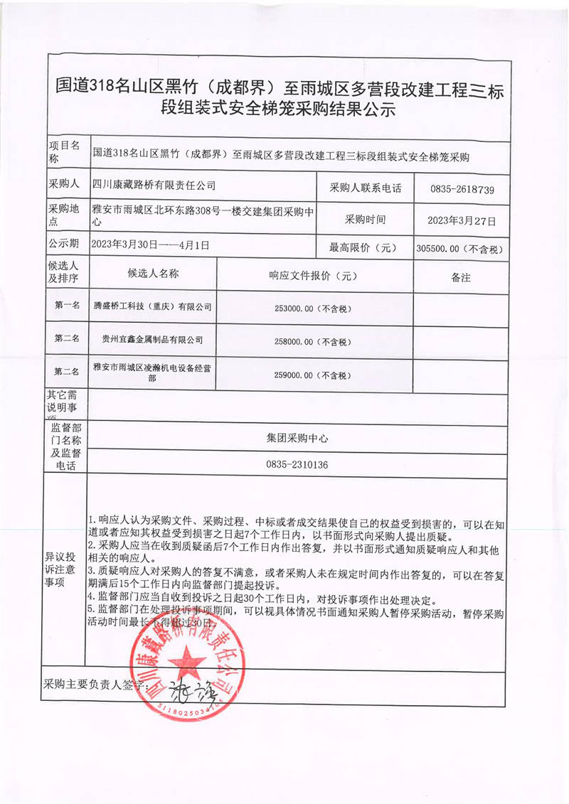 四川康藏路橋有限責任公司國道318名山區(qū)黑竹(成都界)至雨城區(qū)多營段改建工程三標段組裝式安全梯籠采購結(jié)果公示