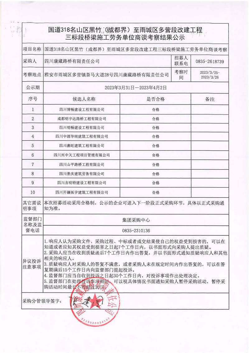 四川康藏路橋有限責(zé)任公司國道318名山區(qū)黑竹(成都界)至雨城區(qū)多營段改建工程三標(biāo)段橋梁施工勞務(wù)單位商談考察結(jié)果公示