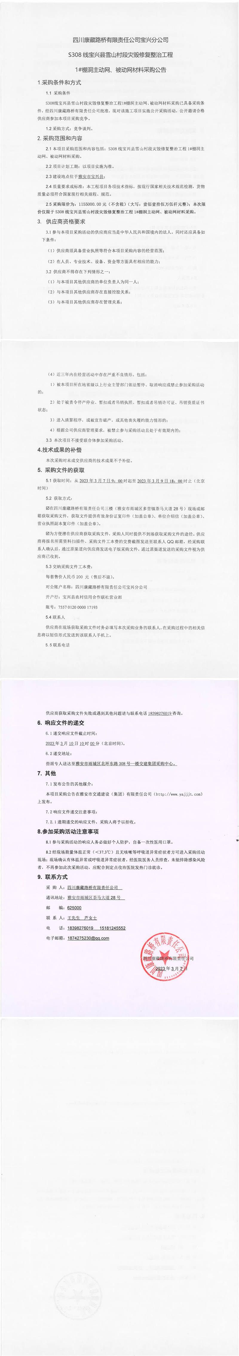 四川康藏路橋有限責(zé)任公司寶興分公司S308線寶興縣雪山村段災(zāi)毀修復(fù)整治工程1#棚洞主動(dòng)網(wǎng)、被動(dòng)網(wǎng)材料采購(gòu)公告