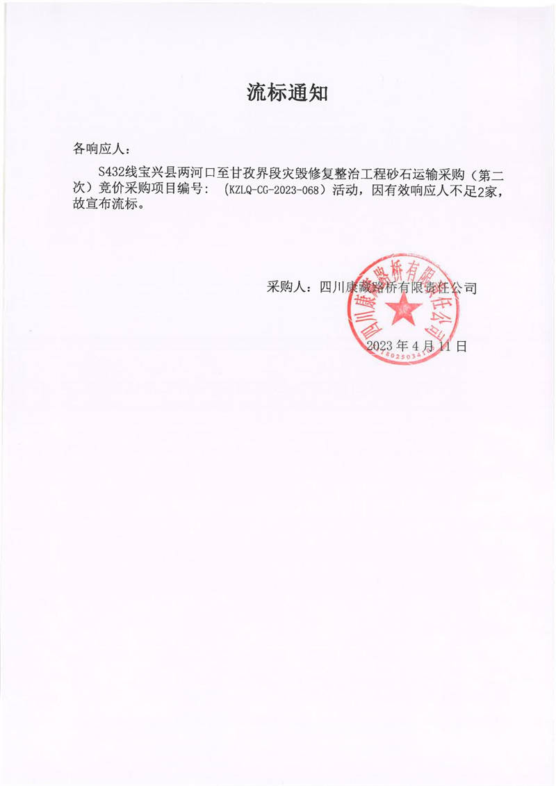 四川康藏路橋有限責任公司寶興分公司S432寶興縣兩河口至甘孜界段災毀修復整治工程砂石運輸采購(第二次)流標通知