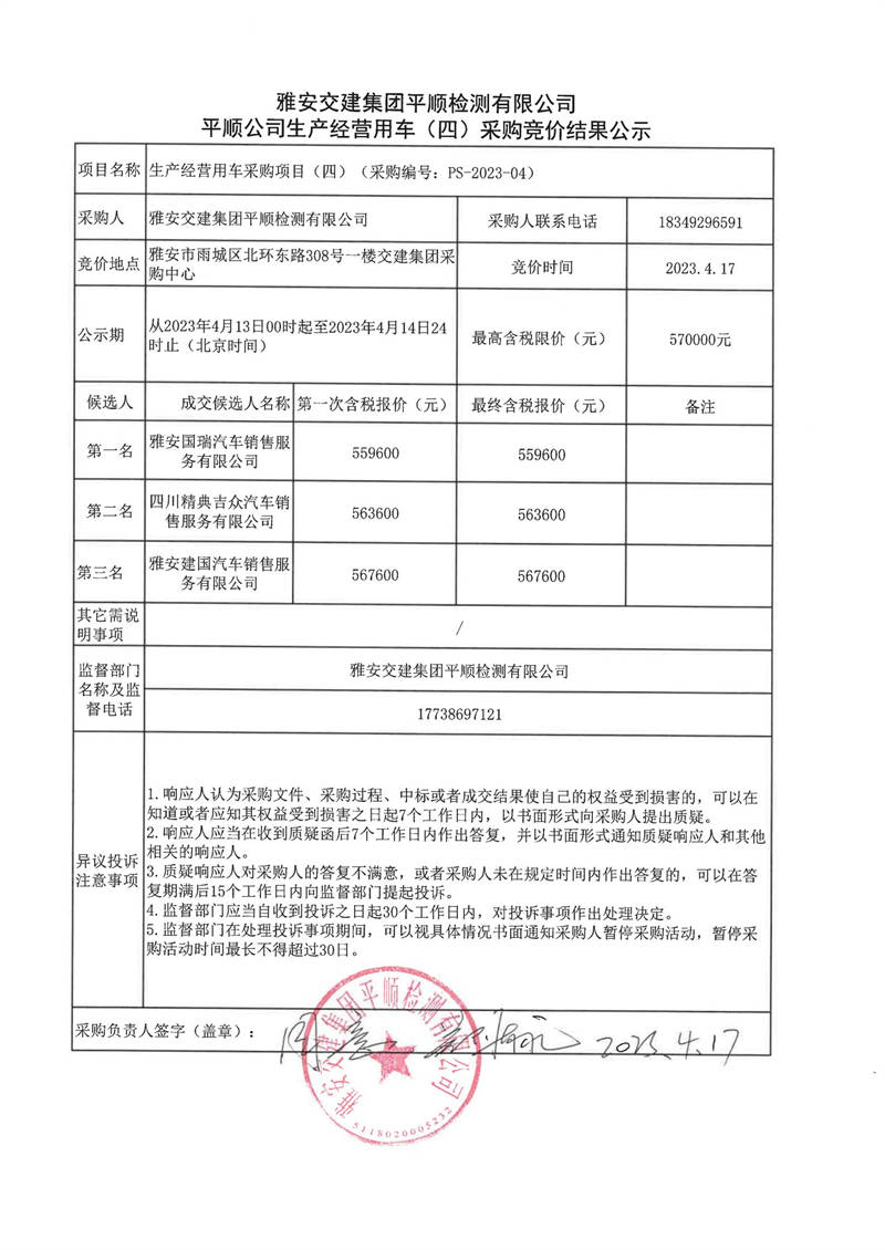 雅安交建集團平順檢測有限公司平順公司生產(chǎn)經(jīng)營用車(四)采購競價結(jié)果公示