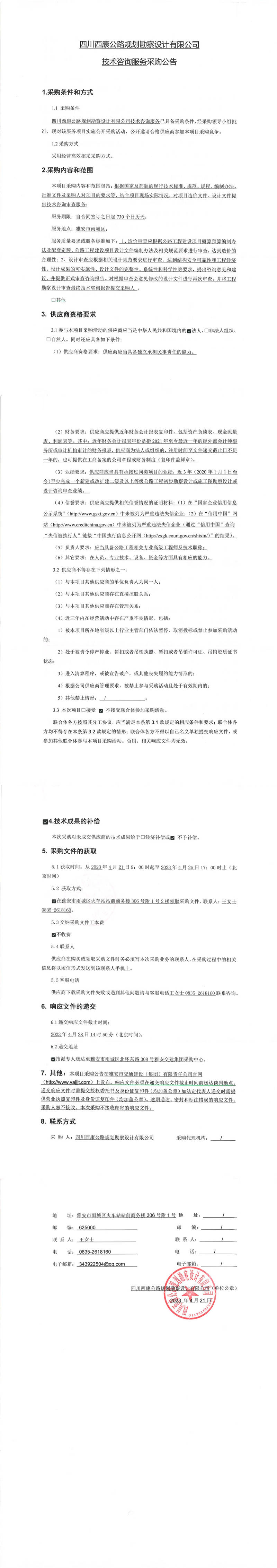 四川西康公路規(guī)劃勘察設(shè)計有限公司技術(shù)服務(wù)采購公告