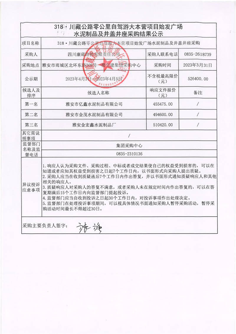 四川康藏路橋有限責任公司318·川藏公路零公里自駕游大本營項目始發(fā)廣場水泥制品及井蓋井座采購結(jié)果公示