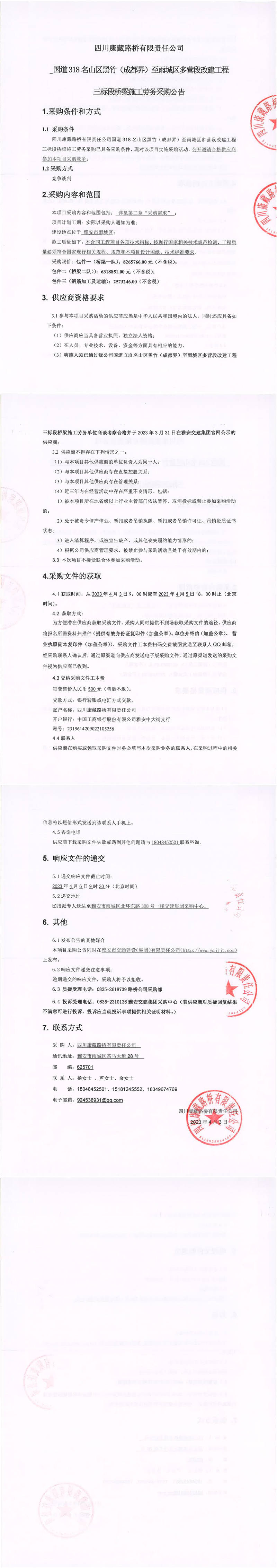 四川康藏路橋有限責任公司國道318名山區(qū)黑竹(成都界)至雨城區(qū)多營段改建工程三標段橋梁施工勞務采購公告
