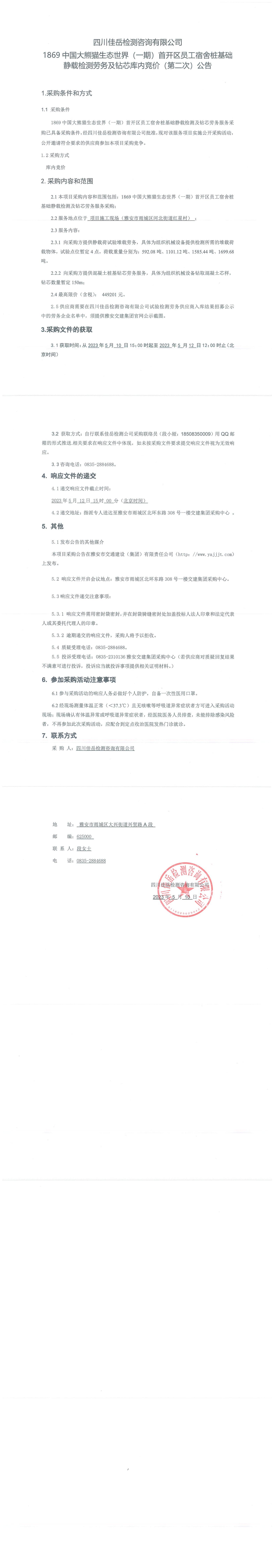 四川佳岳檢測(cè)咨詢有限公司1869中國大熊貓生態(tài)世界(一期)首開區(qū)員工宿舍樁基礎(chǔ)靜載檢測(cè)勞務(wù)及磚芯庫內(nèi)競(jìng)價(jià)(第二次)采購公告
