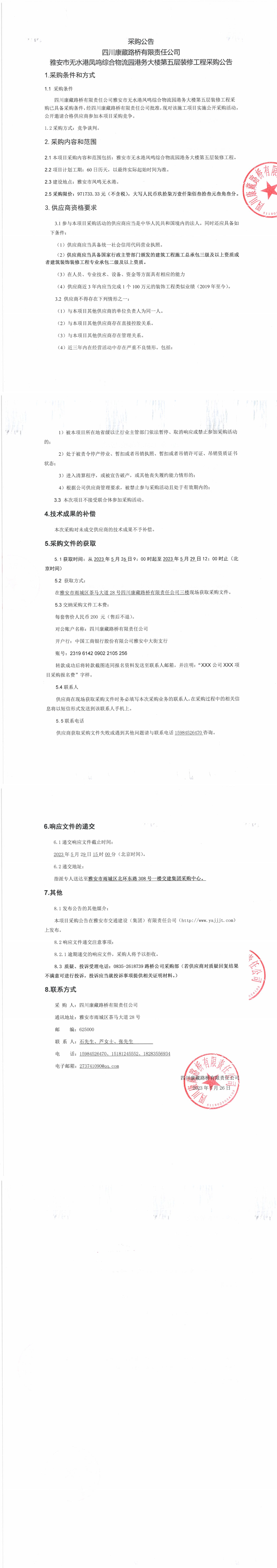 四川康藏路橋有限責(zé)任公司雅安市無水港鳳鳴綜合物流園港務(wù)大樓第五層裝修工程采購公告