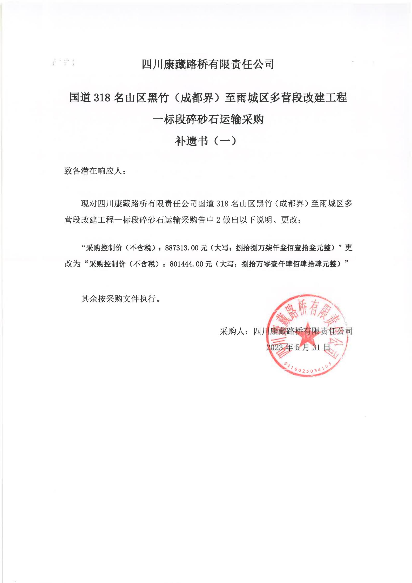 四川康藏路橋有限責(zé)任公司國道318名山區(qū)黑竹(成都界)至雨城區(qū)多營段改建工程一標(biāo)段碎砂石運(yùn)輸采購補(bǔ)遺書(一)