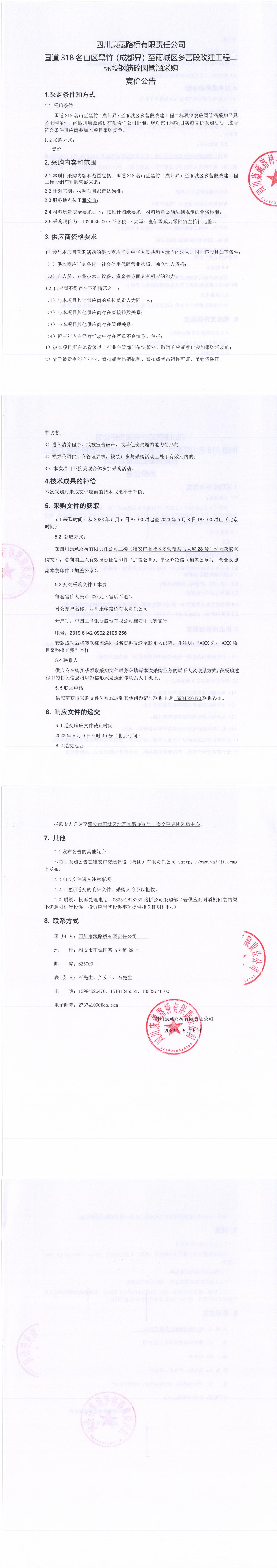 四川康藏路橋有限責任公司國道318名山區(qū)黑竹(成都界)至雨城區(qū)多營段改建工程二標段鋼筋砼圓管涵采購競價公告