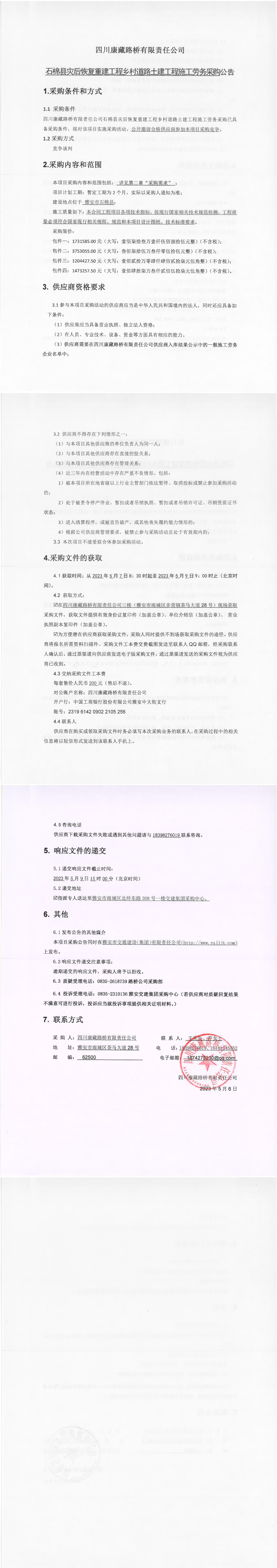 四川康藏路橋有限責(zé)任公司石棉縣災(zāi)后恢復(fù)重建工程鄉(xiāng)村道路土建工程施工勞務(wù)采購(gòu)公告