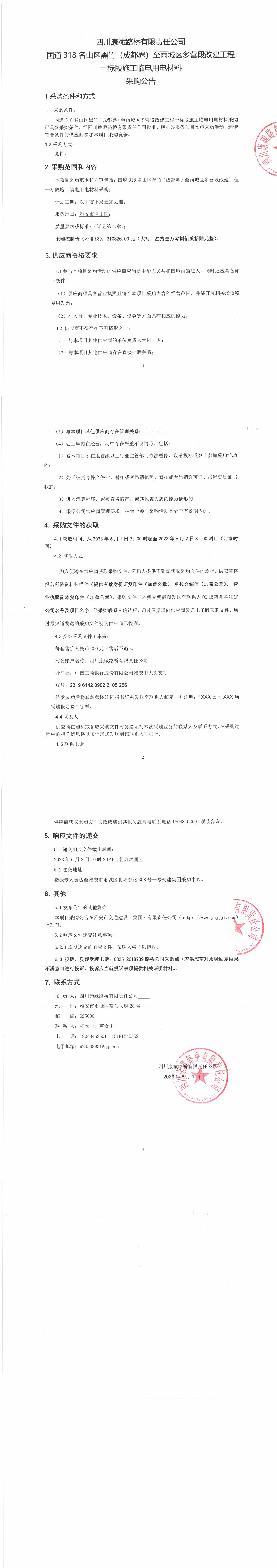 四川康藏路橋有限責(zé)任公司國(guó)道318名山區(qū)黑竹(成都界)至雨城區(qū)多營(yíng)段改建工程一標(biāo)段施工臨電用電材料采購公告