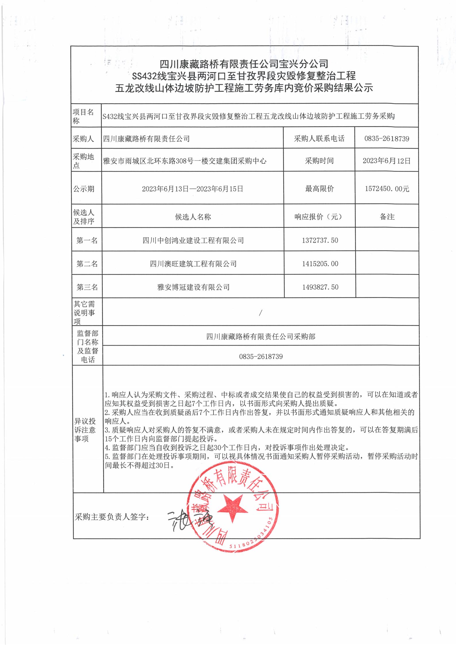 四川康藏路橋有限責(zé)任公司S432線寶興縣兩河口至甘孜界段災(zāi)毀修復(fù)整治工程五龍改線山體邊坡防護(hù)施工勞務(wù)庫內(nèi)競價采購結(jié)果公示