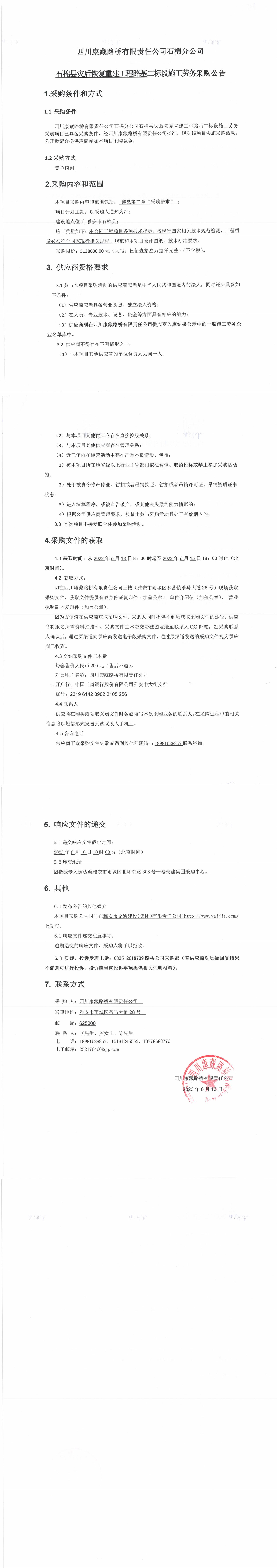 四川康藏路橋有限責任公司石棉分公司石棉縣災后恢復重建工程路基二標段施工勞務采購公告