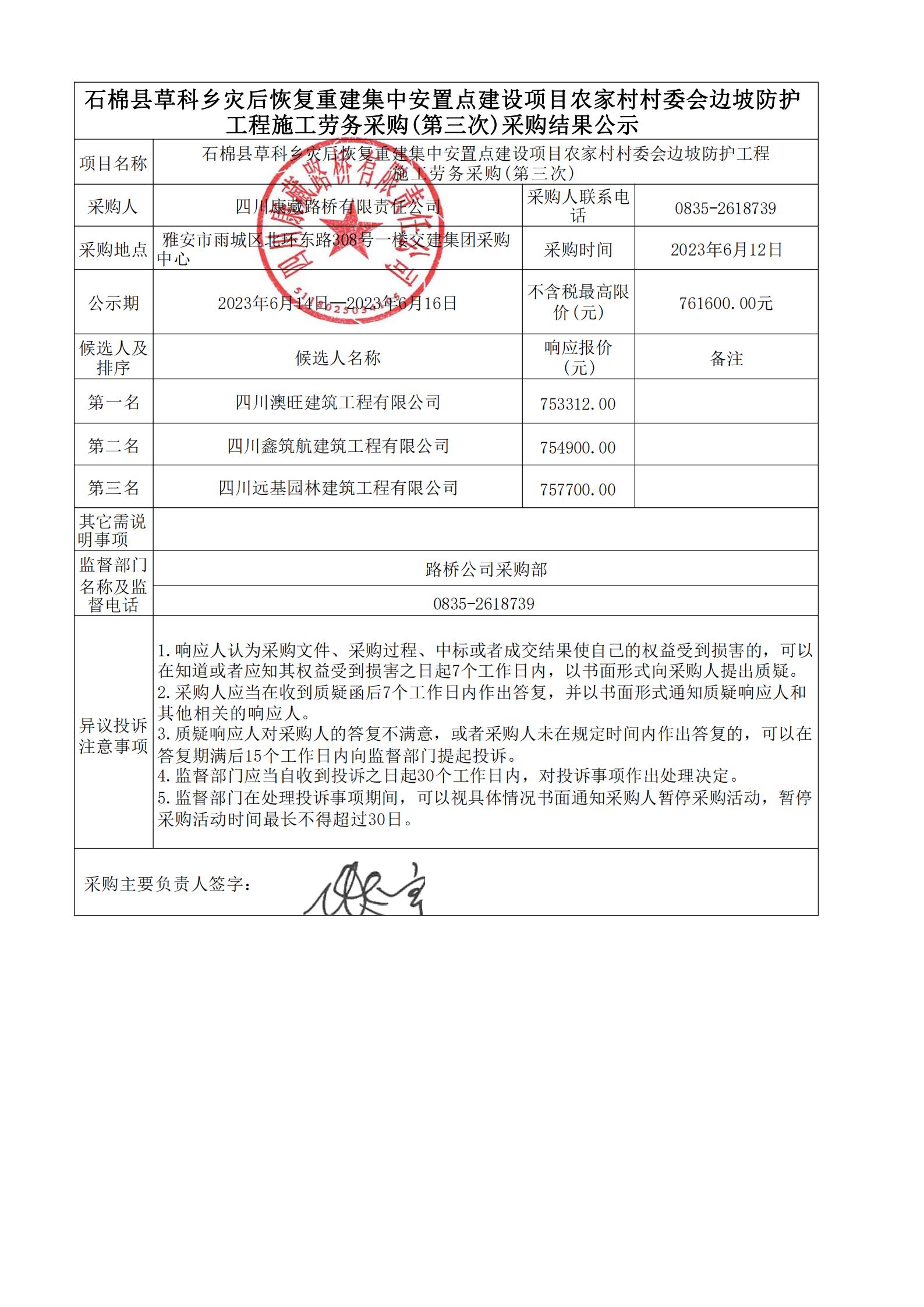 四川康藏路橋有限責(zé)任公司石棉縣草科鄉(xiāng)災(zāi)后恢復(fù)重建集中安置點(diǎn)建設(shè)項(xiàng)目農(nóng)家村村委會(huì)邊坡防護(hù)工程施工勞務(wù)采購(第三次)結(jié)果公示