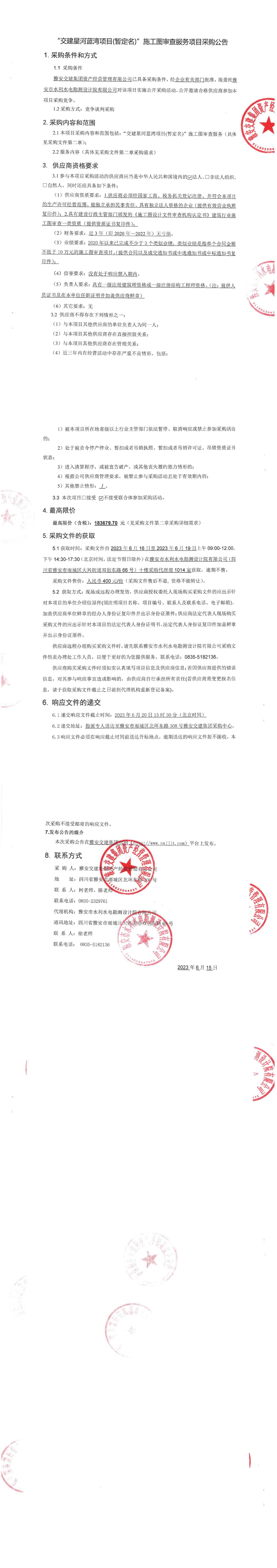 雅安交建集團(tuán)資產(chǎn)經(jīng)營(yíng)管理有限公司“交建星河藍(lán)灣項(xiàng)目(暫定名)”施工圖審查服務(wù)項(xiàng)目采購(gòu)公告