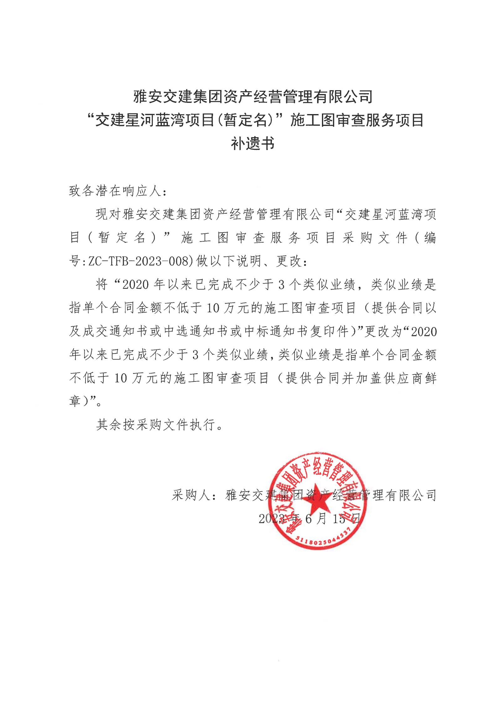 雅安交建集團資產(chǎn)經(jīng)營管理有限公司“交建星河藍灣項目(暫定名)”施工圖審查服務項目采購補遺書