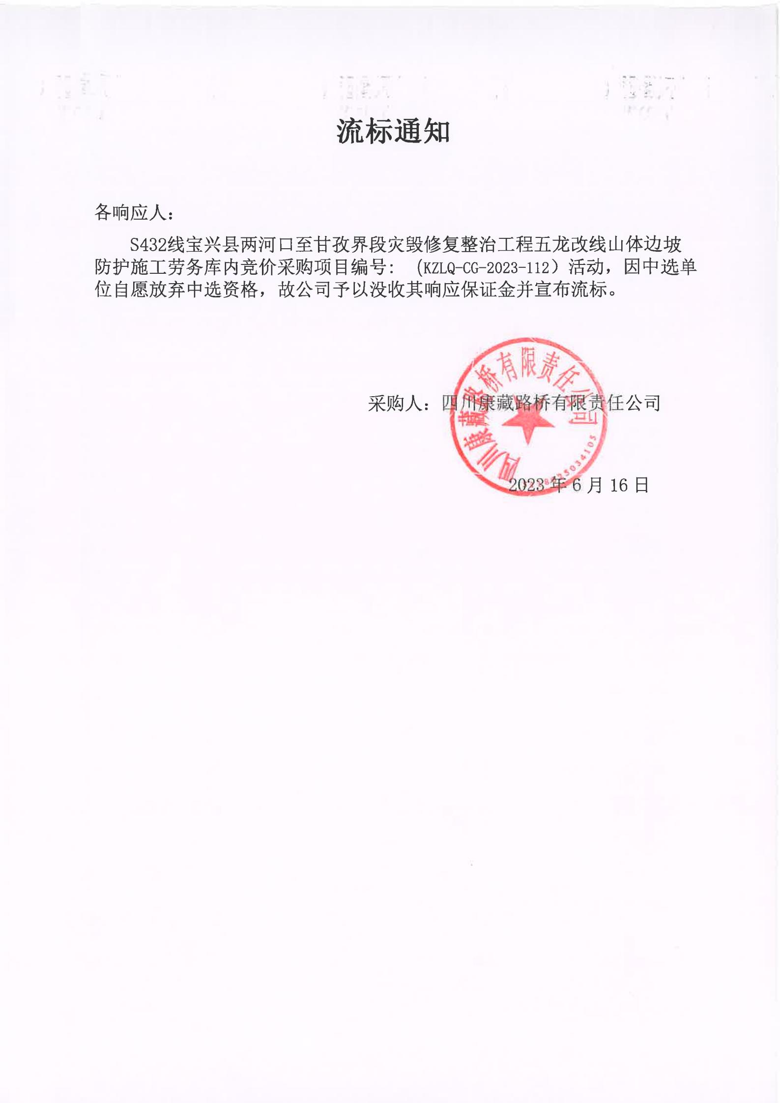 四川康藏路橋有限責任公司S432線寶興縣兩河口至甘孜界段災(zāi)毀修復(fù)整治工程五龍改線山體邊坡防護施工勞務(wù)庫內(nèi)競價流標通知
