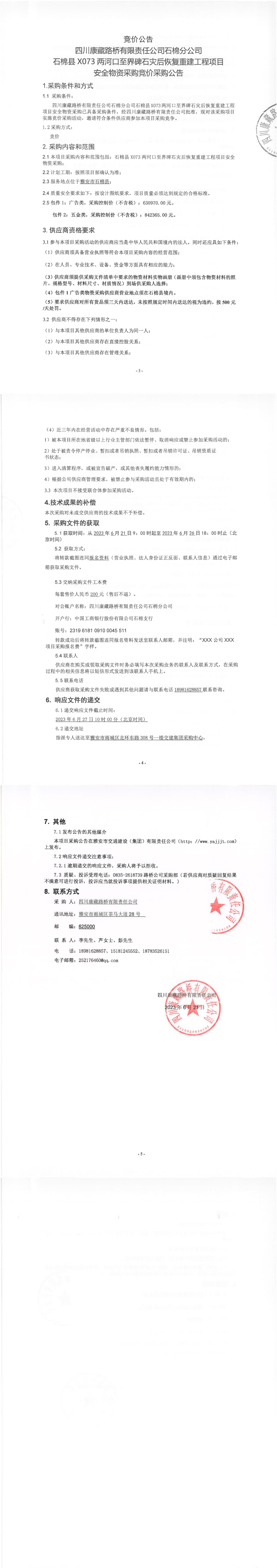 四川康藏路橋有限責(zé)任公司石棉分公司石棉縣X073兩河口至界碑石災(zāi)后恢復(fù)重建工程項(xiàng)目安全物資采購競價(jià)公告