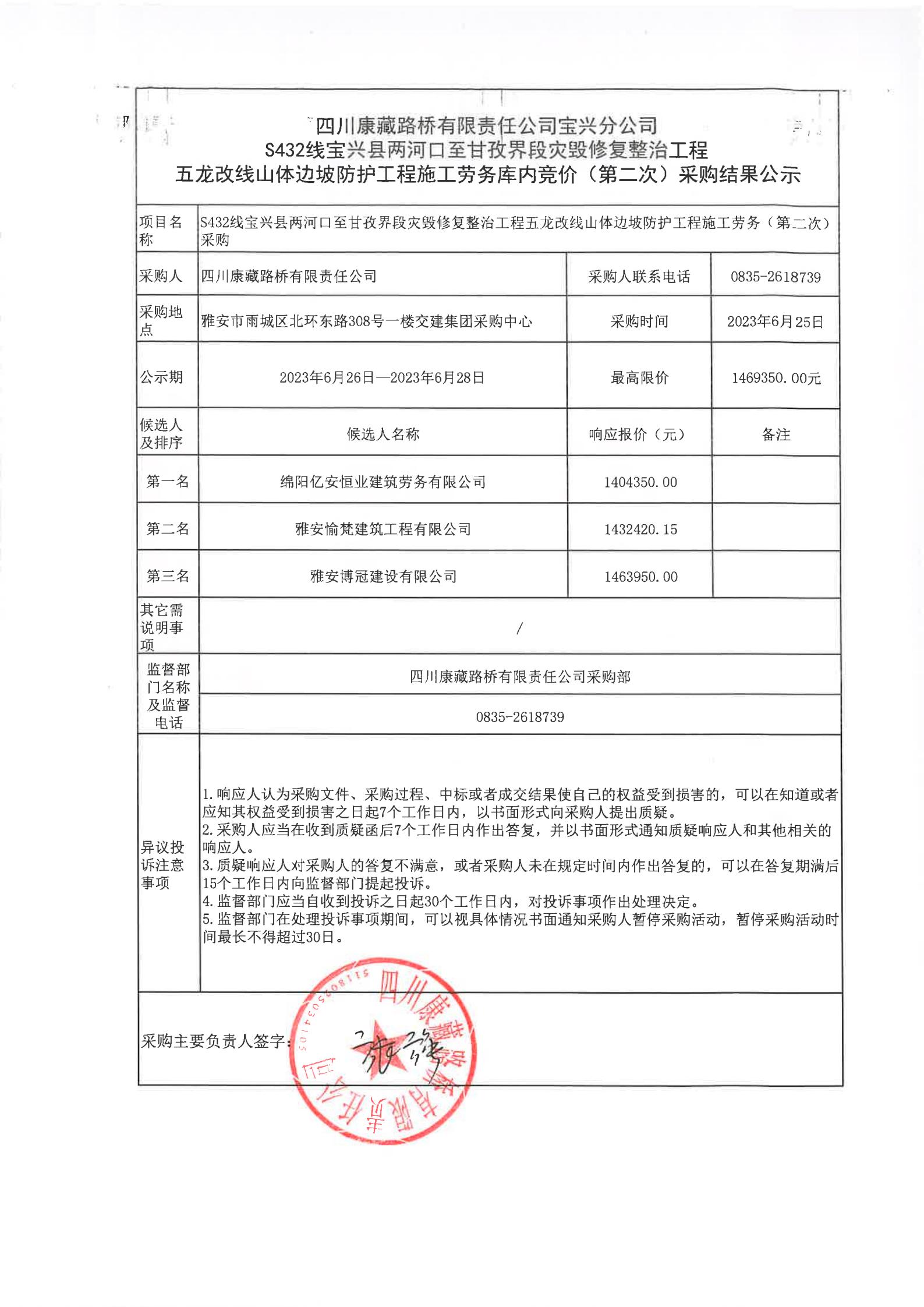 四川康藏路橋有限責任公司寶興分公司S432寶興縣兩河口至甘孜界段災毀修復整治工程五龍改線山體邊坡防護工程施工勞務庫內競價(第二次)結果公示