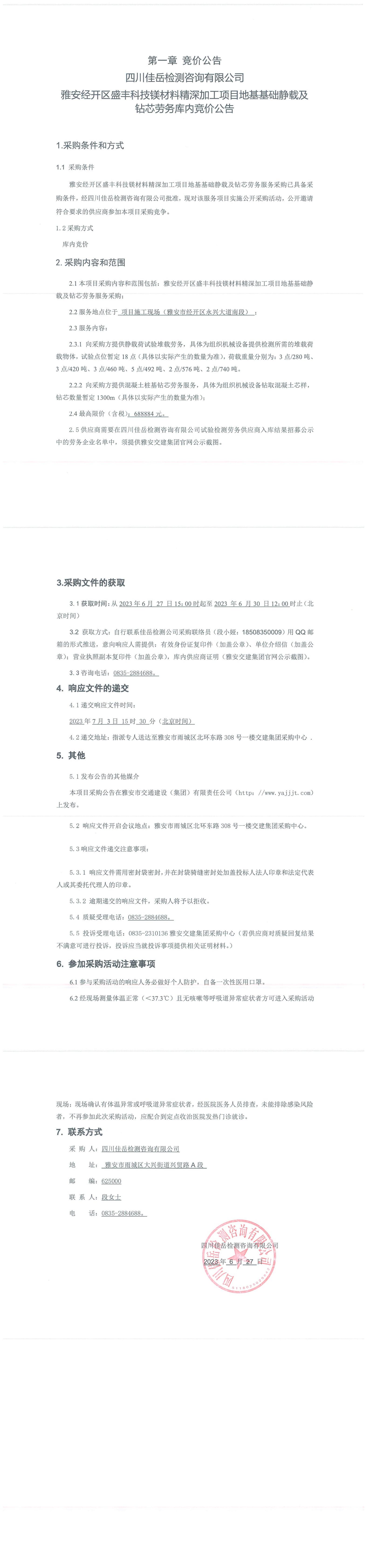 四川佳岳檢測(cè)咨詢有限公司雅安經(jīng)開區(qū)盛豐科技鎂材料精深加工項(xiàng)目地基基礎(chǔ)靜載及鉆芯勞務(wù)庫(kù)內(nèi)競(jìng)價(jià)公告
