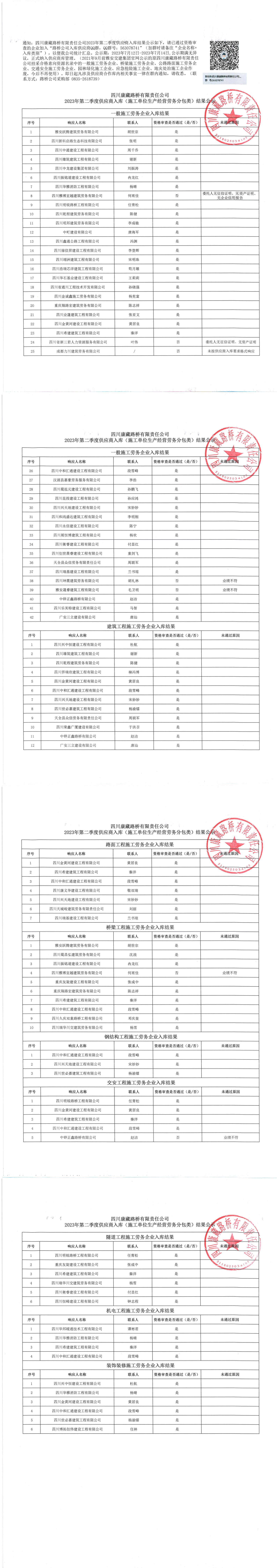 四川康藏路橋有限責(zé)任公司2023年第二季度供應(yīng)商入庫(施工單位生產(chǎn)經(jīng)營勞務(wù)分包類)結(jié)果公示