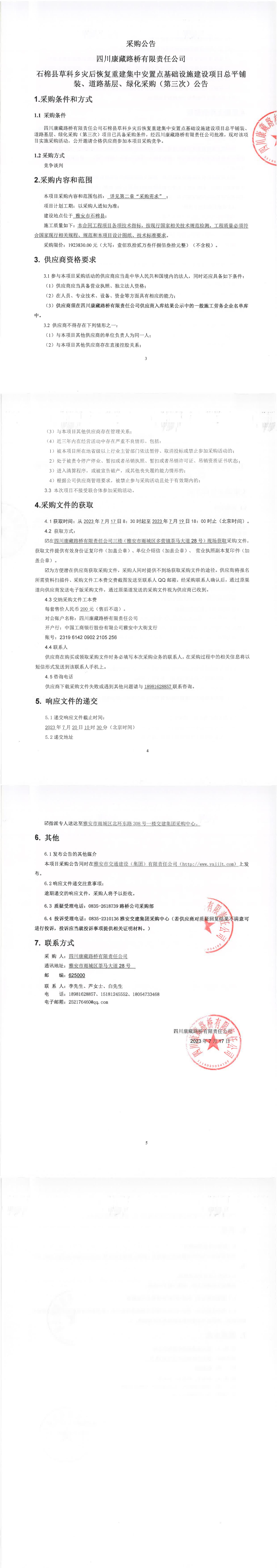 四川康藏路橋有限責任公司石棉縣草科鄉(xiāng)災后恢復重建集中安置點基礎(chǔ)設施建設項目總平鋪裝、道路基層、綠化采購(第三次)公告