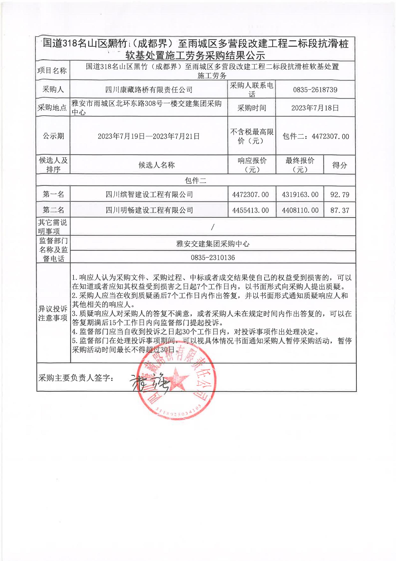 四川康藏路橋有限責(zé)任公司國道318名山區(qū)黑竹(成都界)至雨城區(qū)多營段改建工程二標(biāo)段抗滑樁軟基處置施工勞務(wù)采購結(jié)果公示