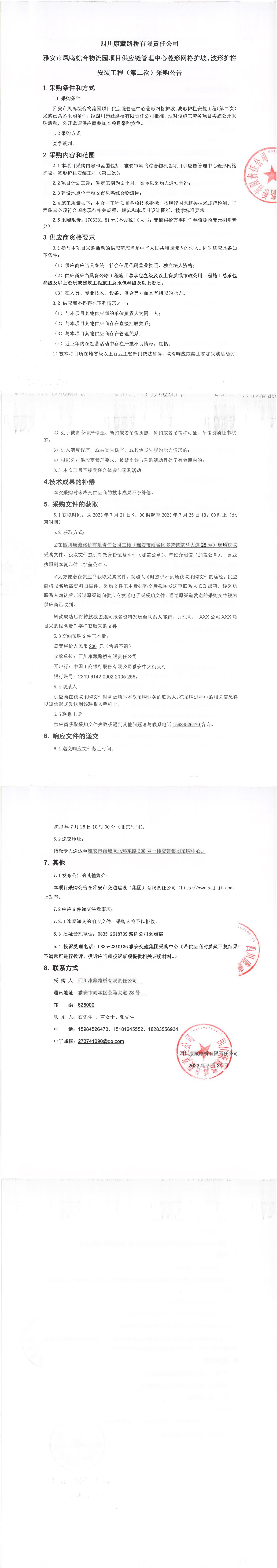 四川康藏路橋有限責任公司雅安市鳳鳴綜合物流園項目供應鏈管理中心菱形網(wǎng)格護坡、波形護欄安裝工程(第二次)采購公告
