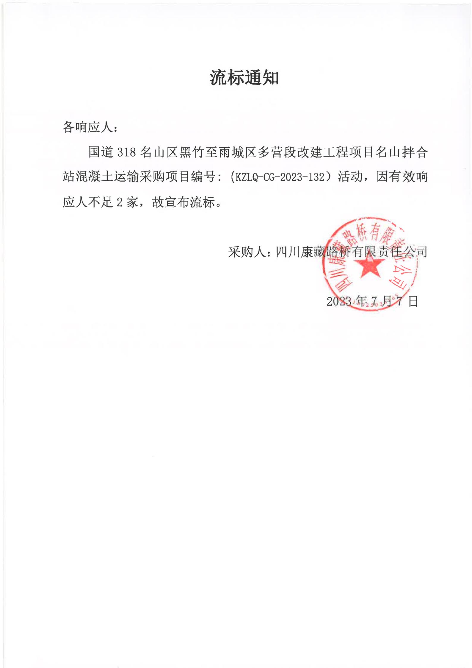 四川康藏路橋有限責(zé)任公司國(guó)道318名山區(qū)黑竹(成都界)至雨城區(qū)多營(yíng)段改建工程項(xiàng)目名山拌合站混凝土運(yùn)輸采購(gòu)流標(biāo)通知