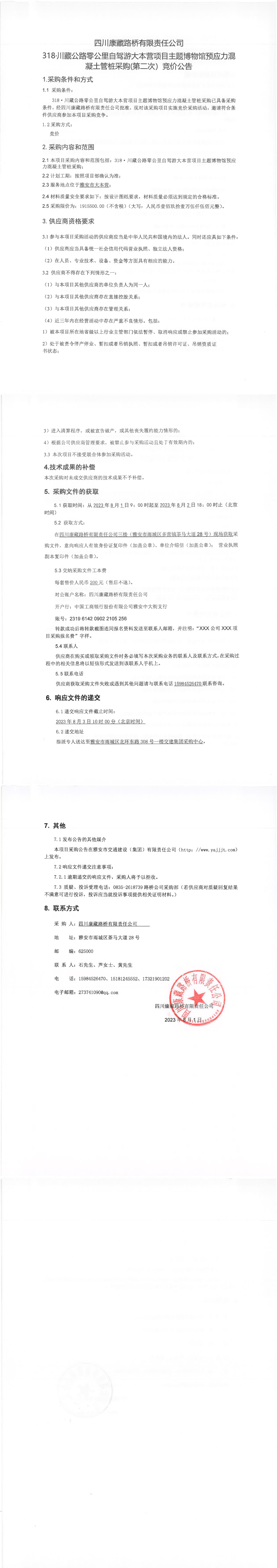 四川康藏路橋有限責(zé)任公司318·川藏公路零公里自駕游大本營項(xiàng)目主題博物館預(yù)應(yīng)力混凝土管樁采購(第二次)競價(jià)公告