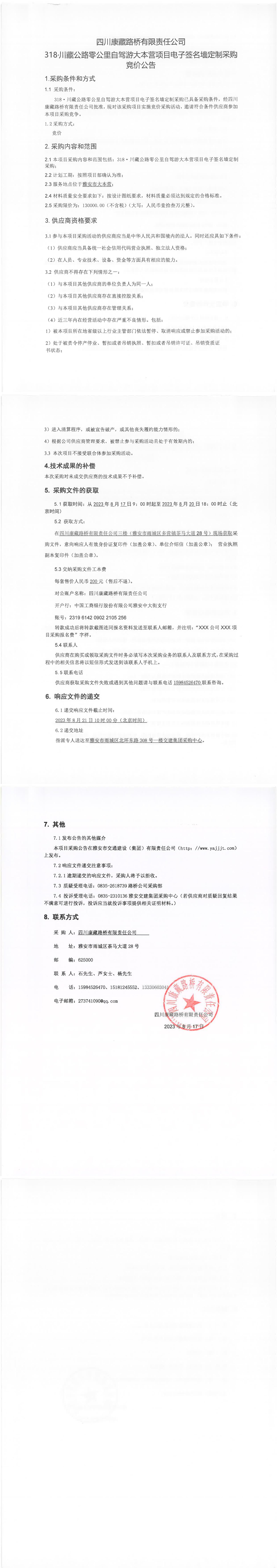 四川康藏路橋有限責(zé)任公司318·川藏公路零公里自駕游大本營項(xiàng)目電子簽名墻定制采購競價(jià)公告