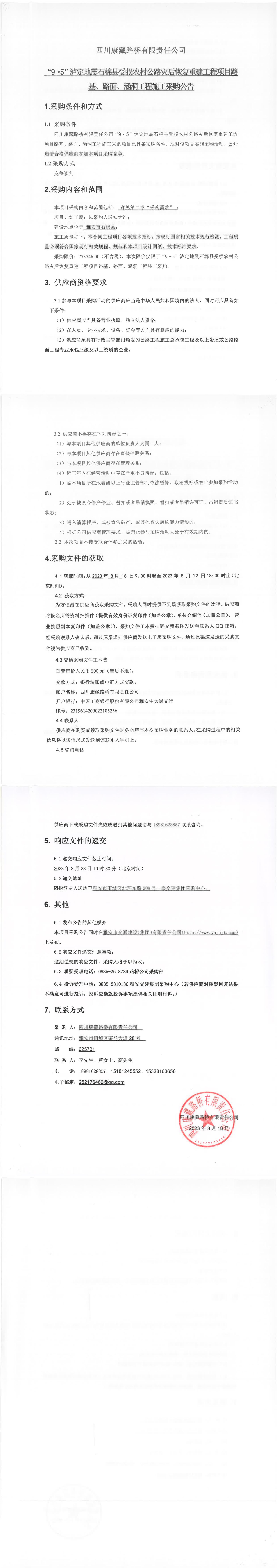 四川康藏路橋有限責(zé)任公司“9·5”瀘定地震石棉縣受損農(nóng)村公路災(zāi)后恢復(fù)重建工程項(xiàng)目路基、路面、涵洞工程施工采購公告