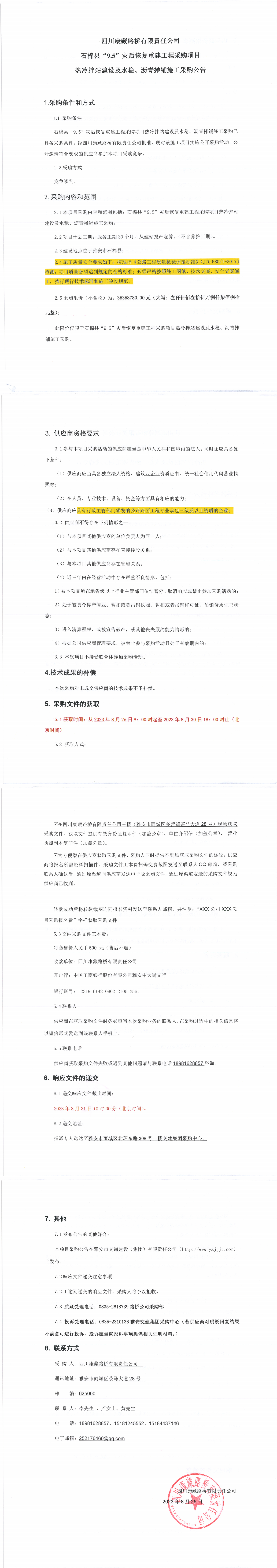 四川康藏路橋有限責任公司石棉縣“9.5”災后恢復重建工程采購項目熱冷拌站建設及水穩(wěn)、瀝青攤鋪施工采購公告