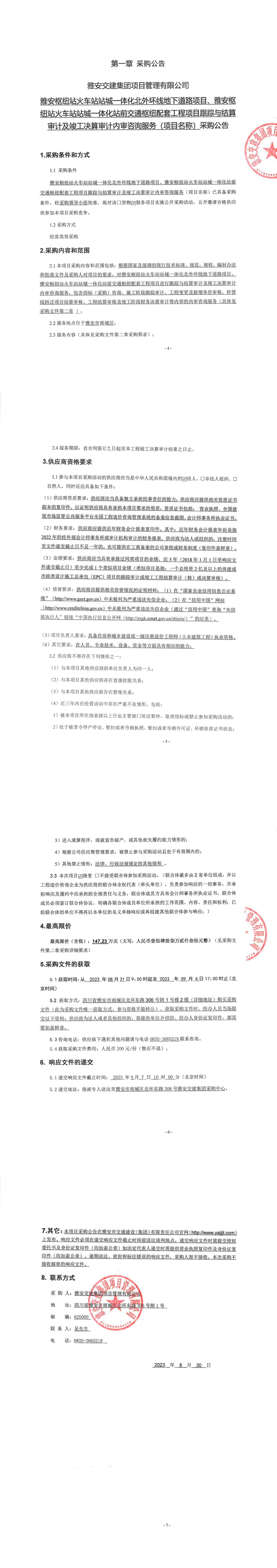 雅安交建集團項目管理有限公司雅安樞紐站火車站站城一體化北外環(huán)線地下道路項目、樞紐站火車站站成一體化站前交通樞紐配套工程項目跟蹤與結(jié)算審計及竣工決算審計內(nèi)審咨詢服務(wù)(項目名稱)采購公告