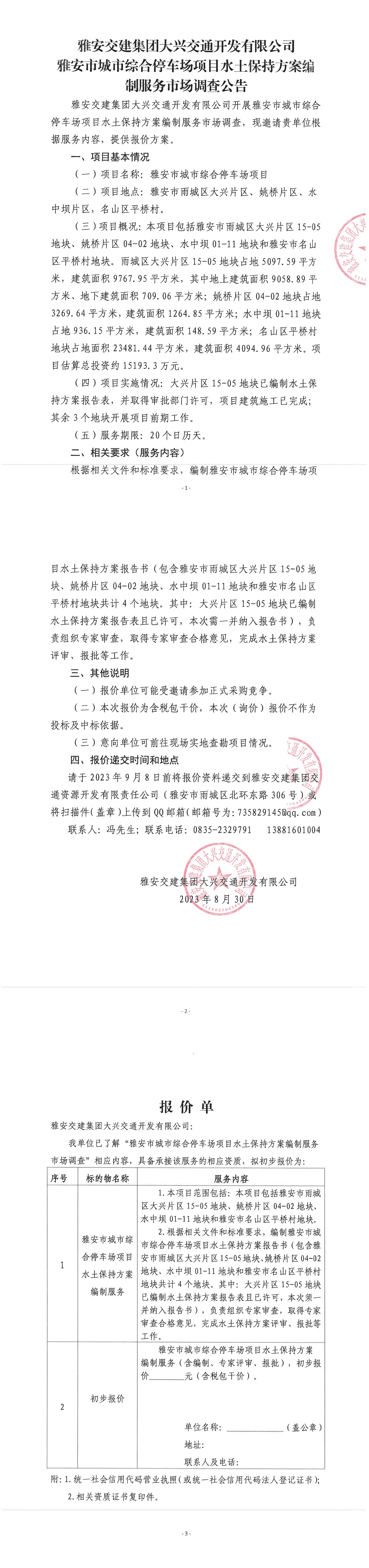 雅安交建集團大興交通開發(fā)有限公司雅安市城市綜合停車場項目水土保持方案編制服務(wù)市場調(diào)查公告
