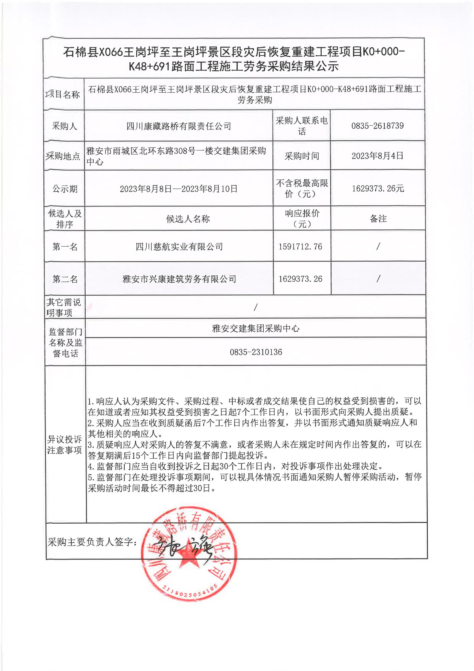 四川康藏路橋有限責(zé)任公司石棉縣X066王崗坪至王崗坪景區(qū)段災(zāi)后恢復(fù)重建工程項目K0+000-K48+691路面工程施工勞務(wù)采購結(jié)果公示
