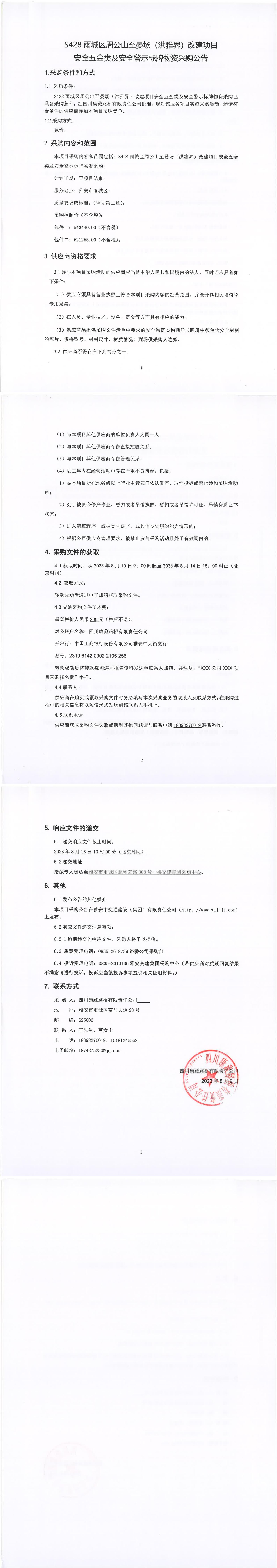 四川康藏路橋有限責(zé)任公司S428雨城區(qū)周公山至宴場(chǎng)(洪雅界)改建項(xiàng)目安全五金類及安全警示標(biāo)牌物資采購(gòu)公告