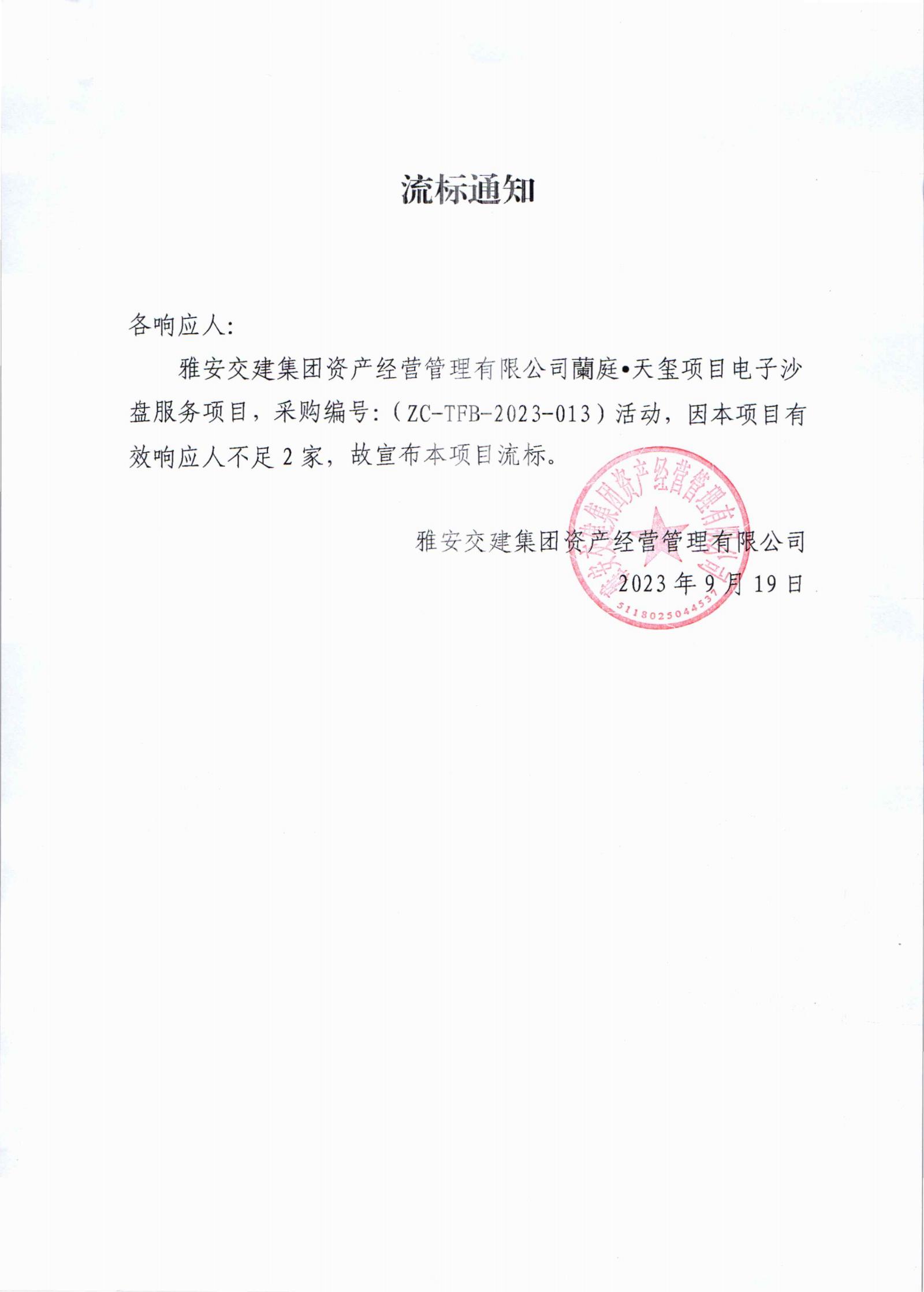 雅安交建集團(tuán)資產(chǎn)經(jīng)營管理有限公司蘭庭•天璽項(xiàng)目電子沙盤服務(wù)項(xiàng)目流標(biāo)通知書