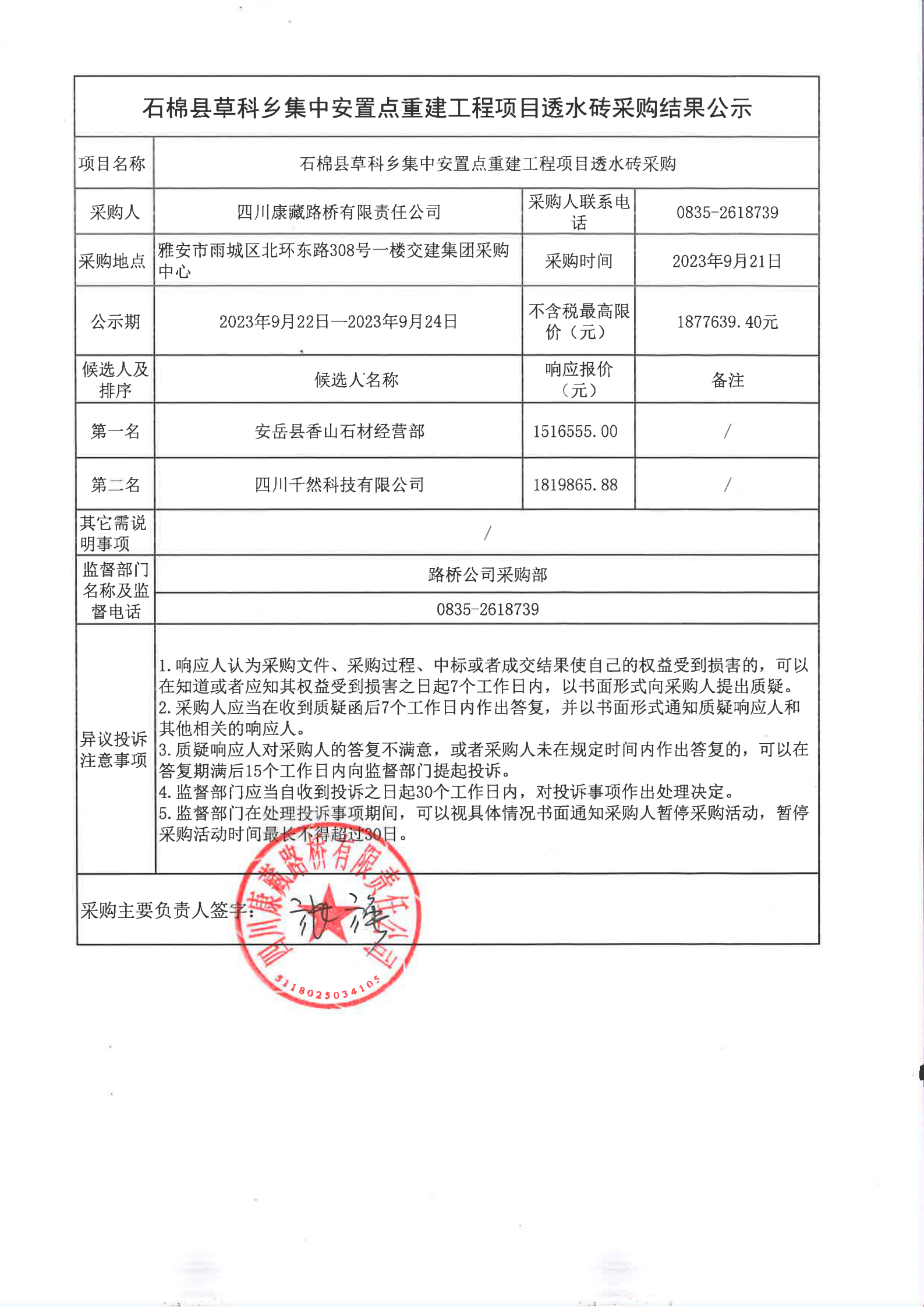 四川康藏路橋有限責(zé)任公司石棉縣草科鄉(xiāng)集中安置點重建工程項目透水磚采購結(jié)果公示